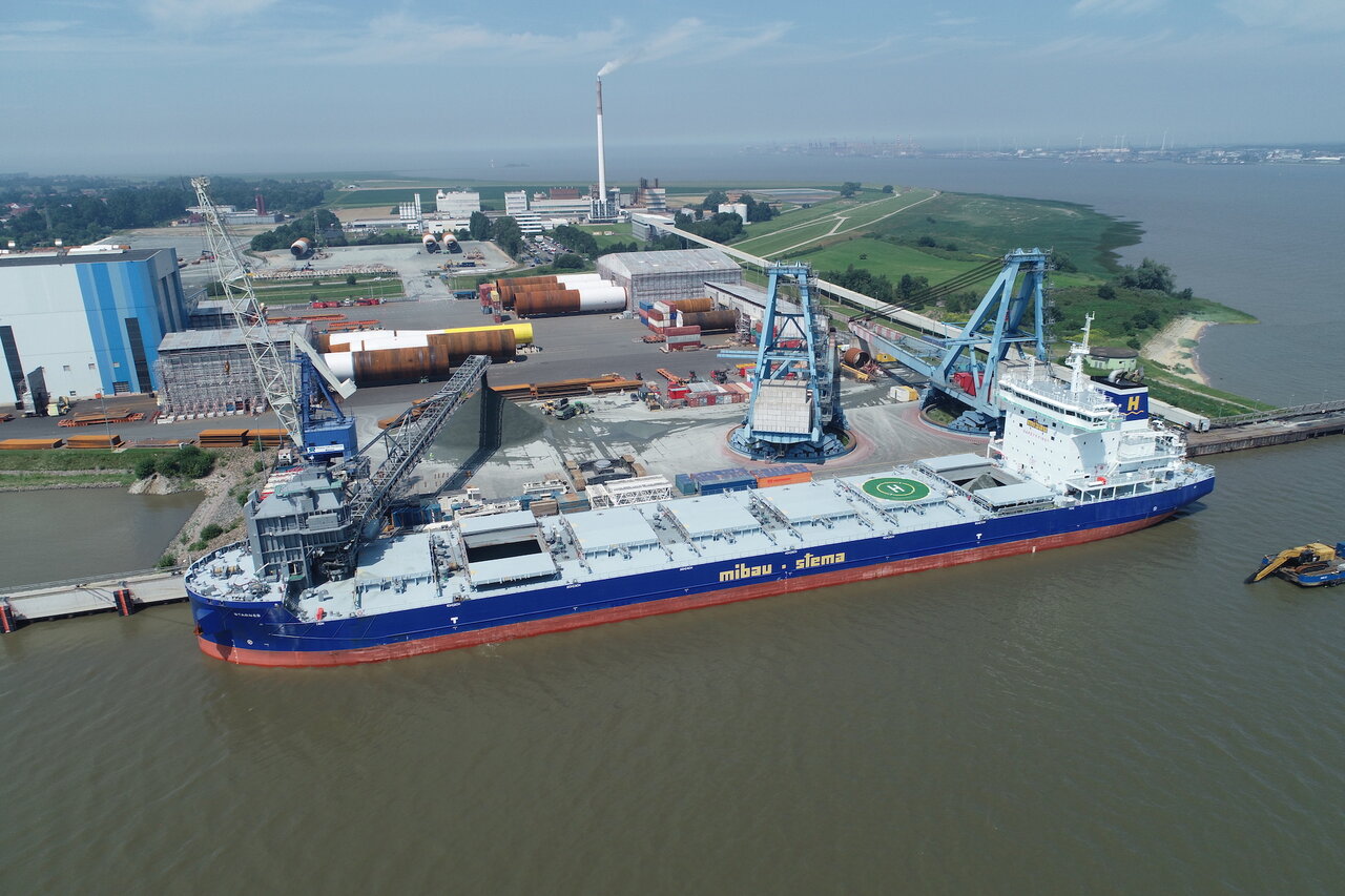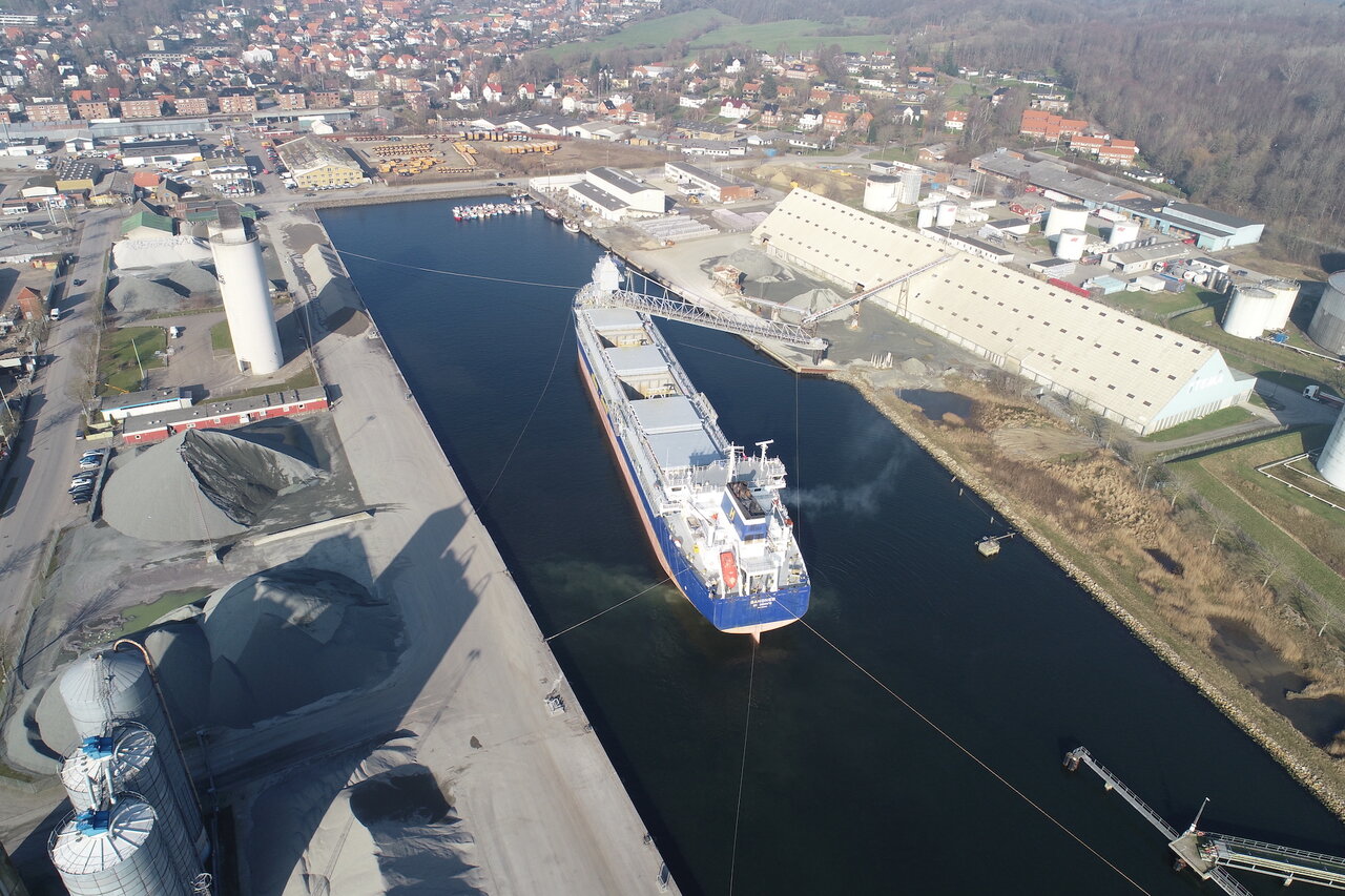 Levering af tilslagsmateriale til en byggeplads med begrænset manøvreplads – med skibet i "spider mode".