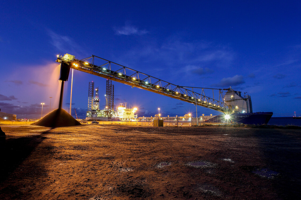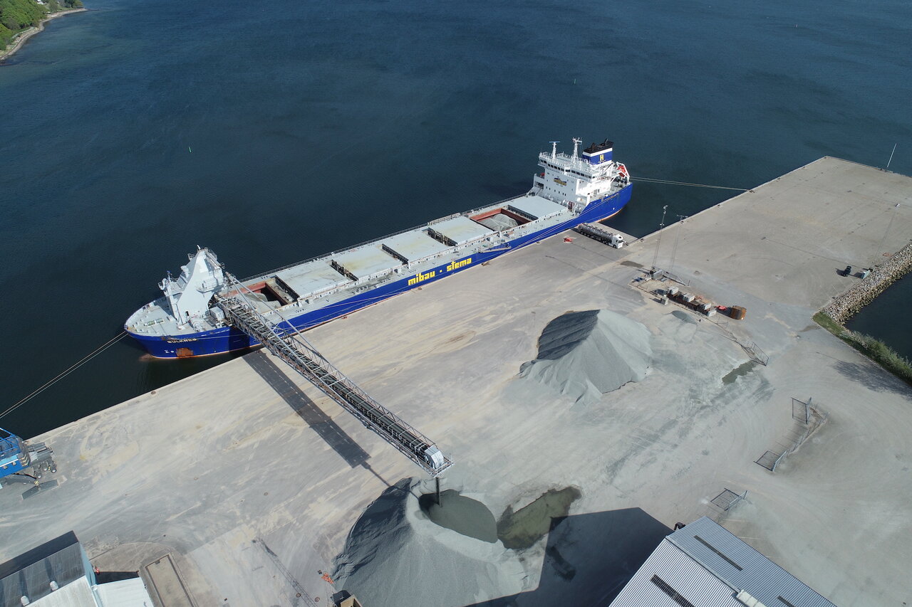Levering af tilslagsmaterialer til en af vores terminaler. Losning med op til 5.500 ton/t.